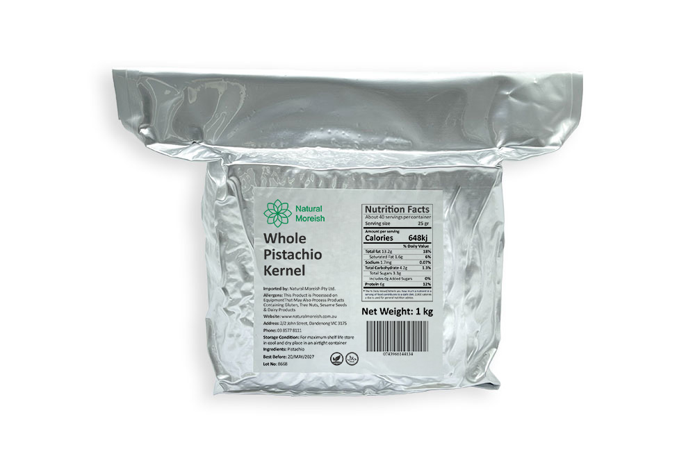 Our all-natural whole pistachio kernels are rich in taste while crunchy in texture. Natural Moreish Whole kernel Pistachios are a joy to eat for anyone who craves Pistachio Nuts. Stock up on our delicious pistachio kernels in bulk or retail to add them to salads for a tasty and attractive addition, replace pine nuts in pesto or add them to cookies and cakes.